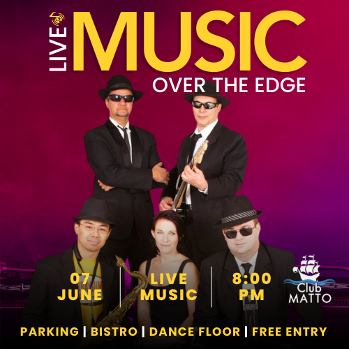 Date 07 Jun 2025 Expired! Time 8:00 pm - 11:00 pm Live Band : Over The Edge Over The Edge playing live in the Auditorium from 8pm to 11pm.
