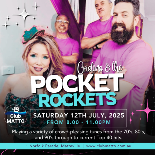 Date 12 Jul 2025 Expired! Time 8:00 pm - 11:00 pm Live Band : Pocket Rockets Pocket Rockets playing live in the Auditorium from 8pm to 11pm.